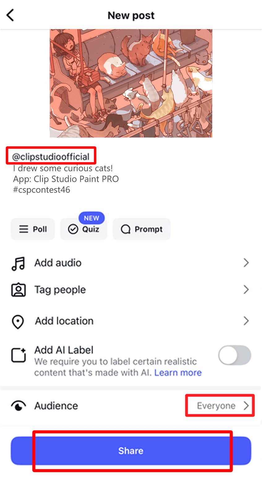 - اثر خود را همراه با هشتگ(های) مسابقه ارسال کرده و حساب رسمی @clipstudioofficial را منشن کنید.